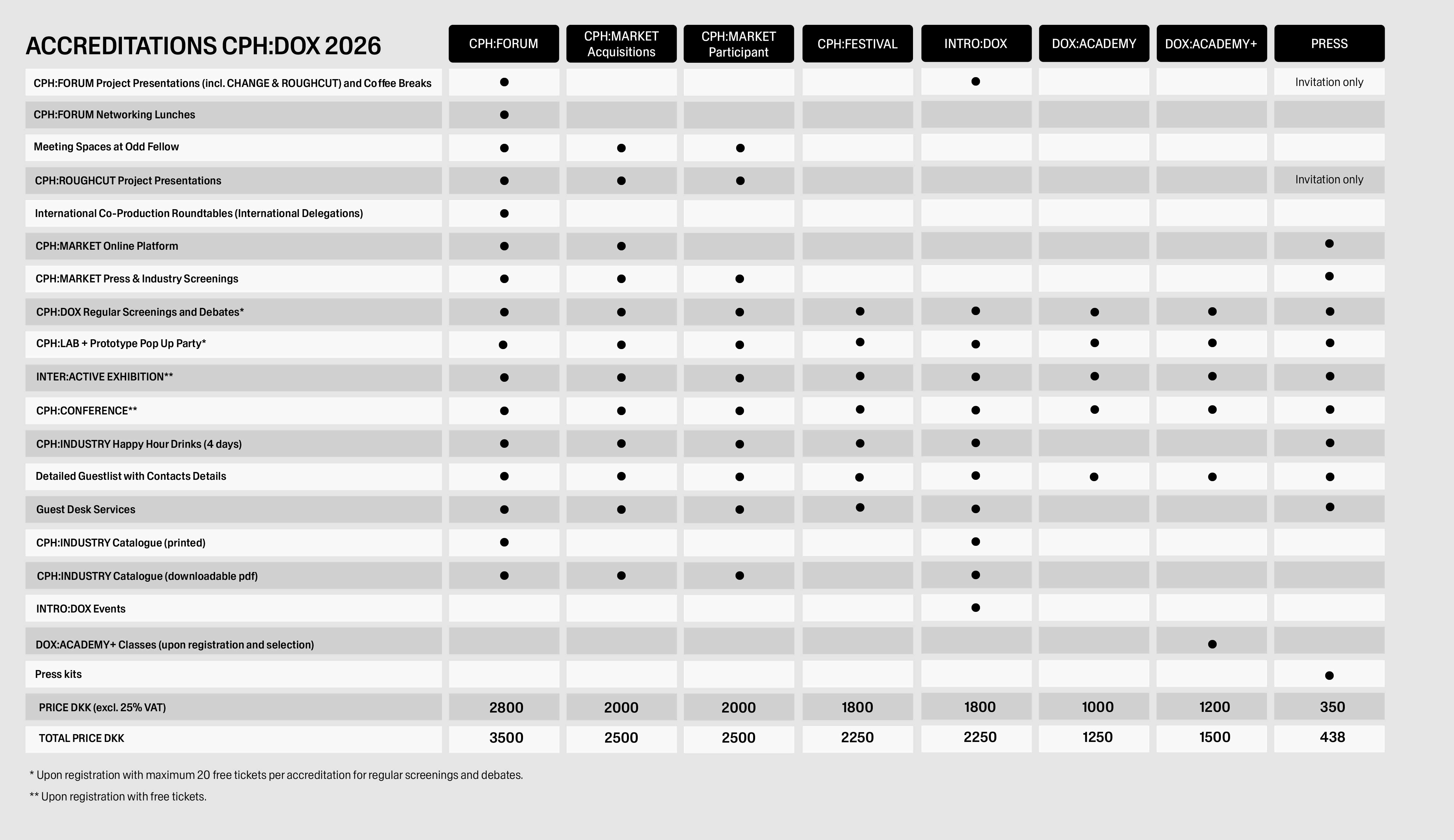 Both DOX:ACADEMY accreditations provide access to the full film programme during the entire festival in the cinemas in Copenhagen, to CPH:CONFERENCE and to all events of regular ticket price.