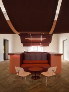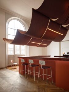 ”Med etableringen af et midlertidigt rum som dette, har vi en unik mulighed for at være nysgerrige i vores designtilgang. Vi er gået undersøgende til værks på den måde, at de mange forskellige komponenter, der indgår i både bar, biograf og lounge, gemmes til de næste år og sættes op igen – men blot på nye måder,” fortæller Mikkel Møller Roesdahl om ambitionen om at skabe et rum, der føles markant og gennemarbejdet, selvom det er midlertidigt.